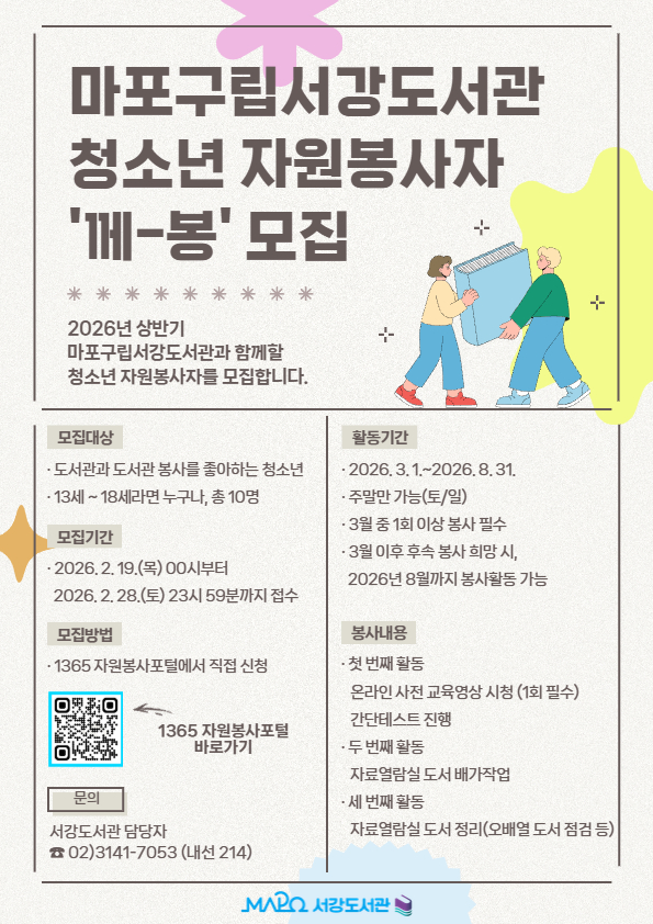 [마포구립서강도서관] [모집] 2026년 상반기 청소년 자원봉사자 '께-봉' 모집