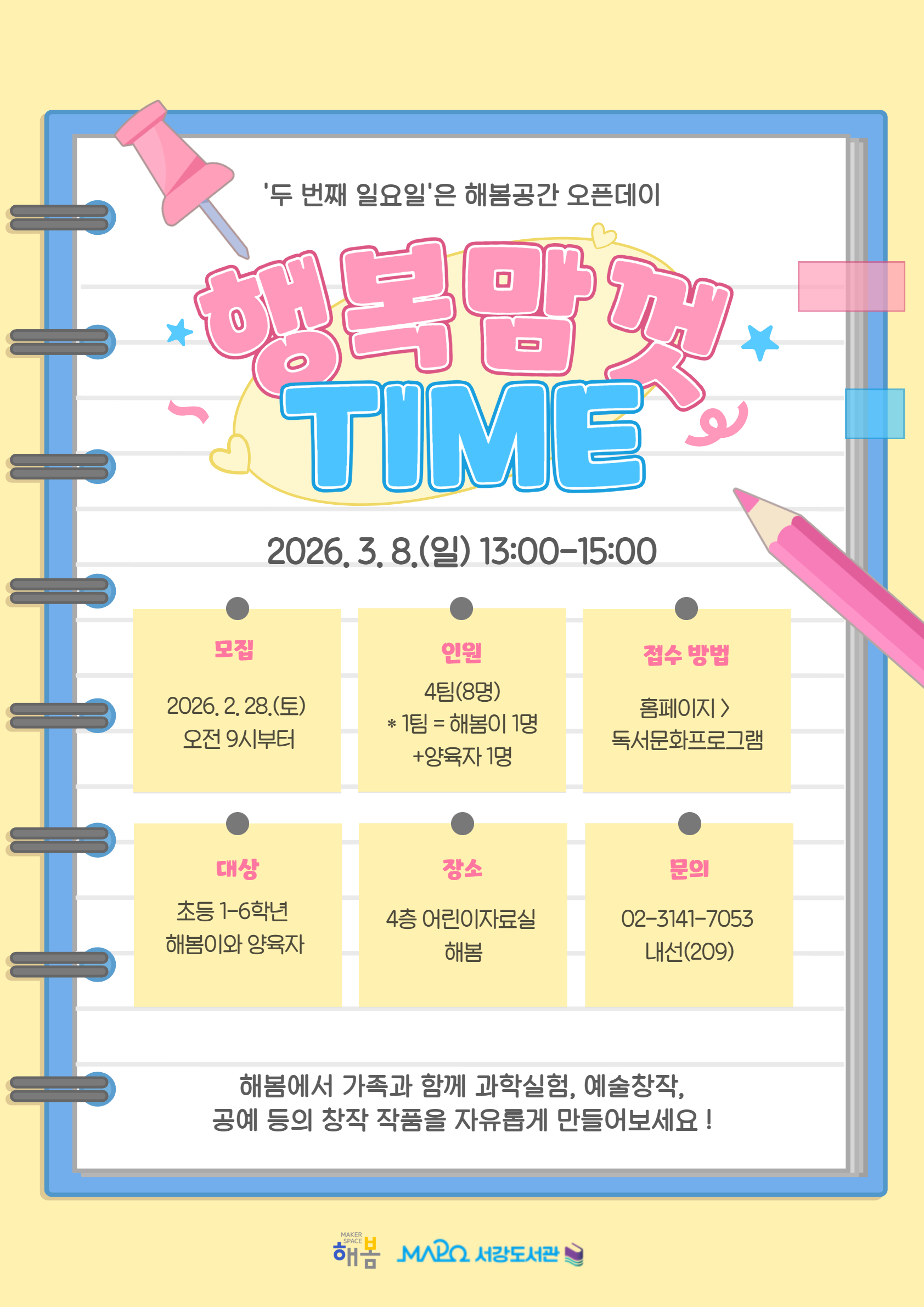 모집 : 2026. 2. 28.(토) 오전 9시부터 인원 : 4팀/8명 ※ 1팀 = 해봄이 1명+양육자 1명 접수방법 : 홈페이지 > 독서문화프로그램 대상 : 초등1-6학년 해봄이와 양육자 장소 : 4층 어린이자료실 해봄 문의 : 02-3141-7053(내선 209)