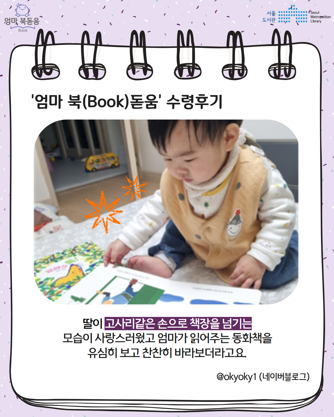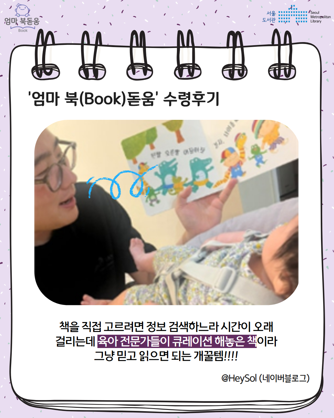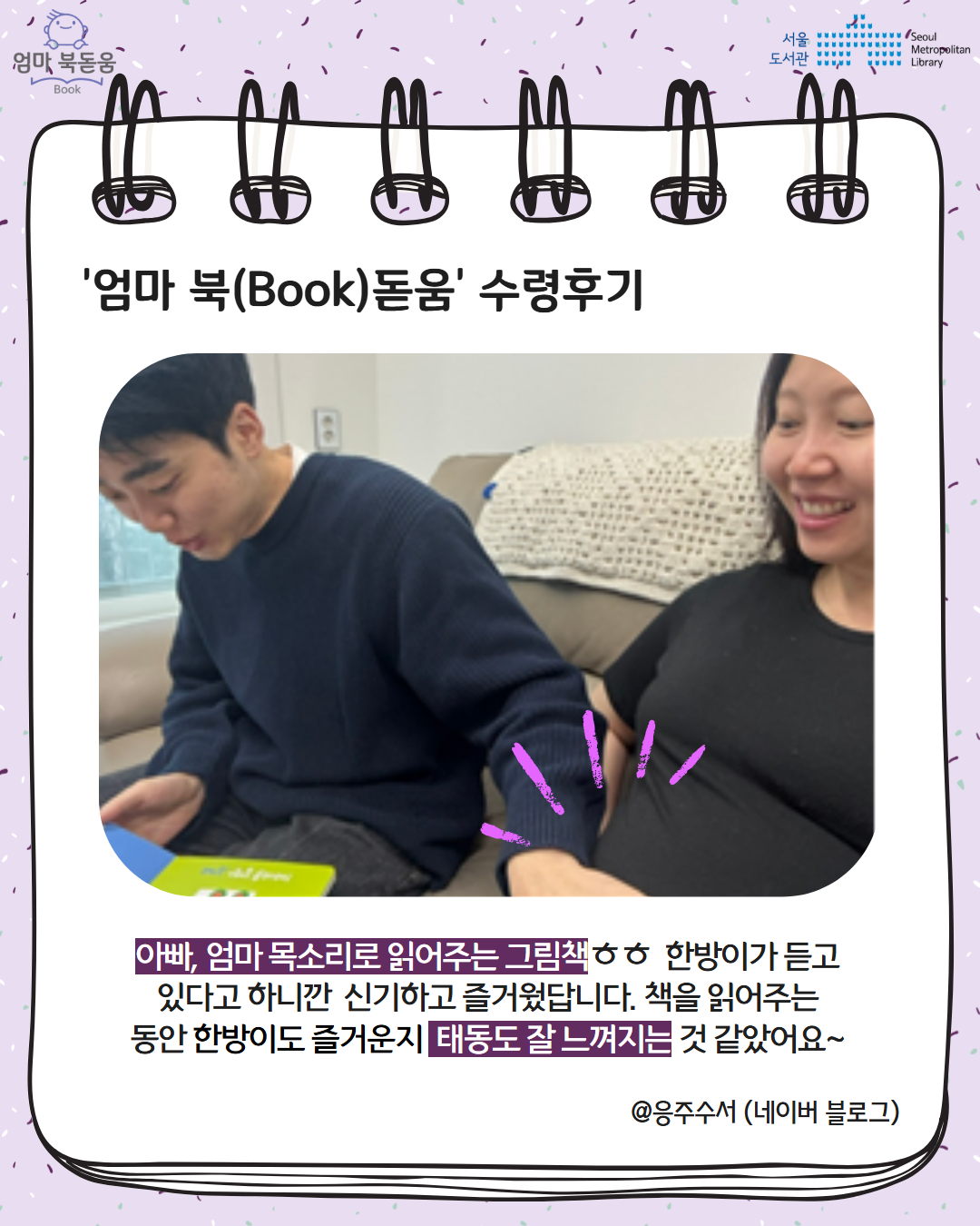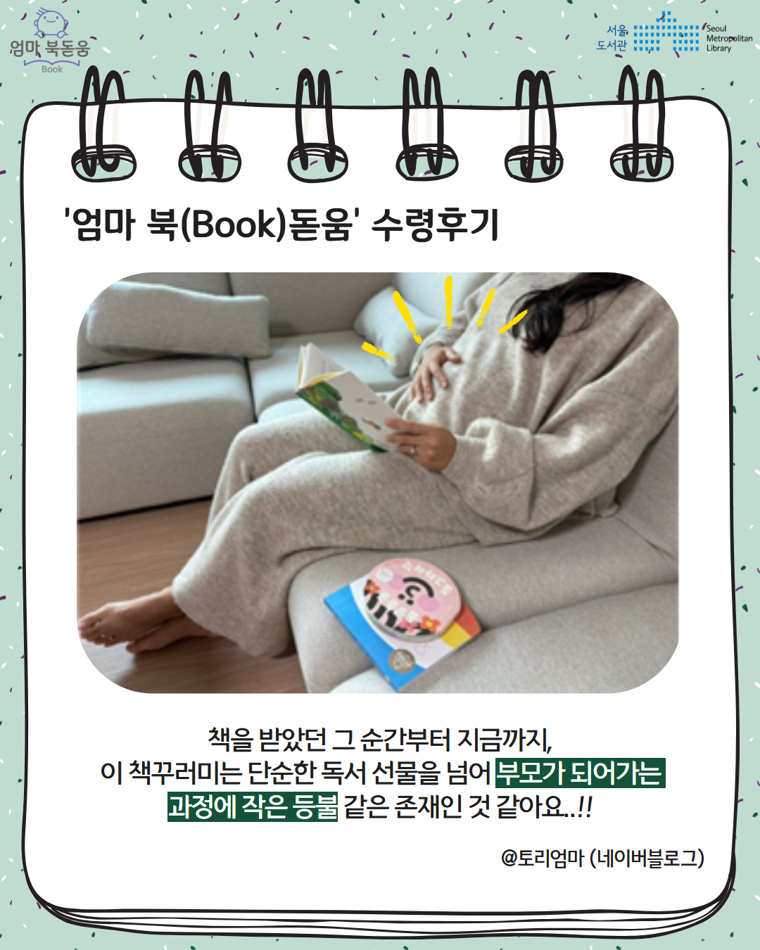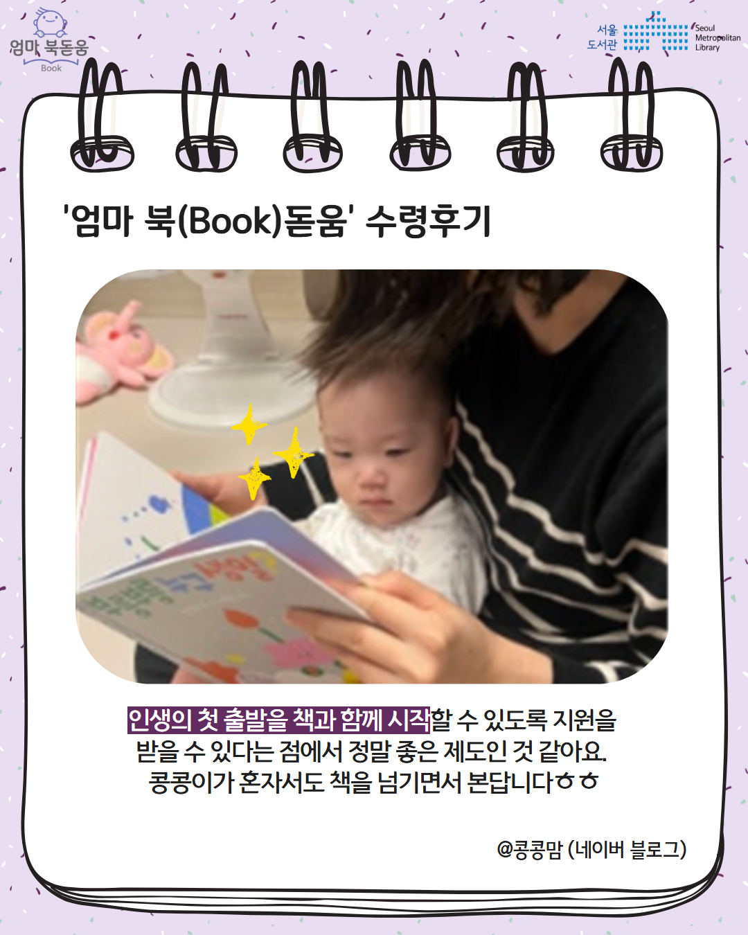 서울시 북스타트 엄마 북돋움 책선물을 받은 엄마아빠의 이야기를 들어보세요.