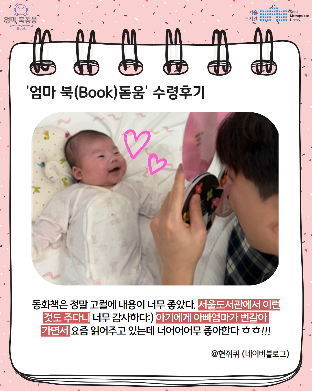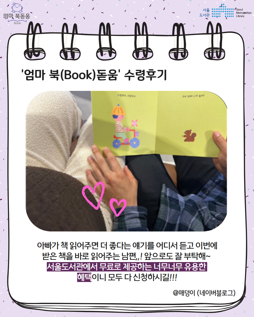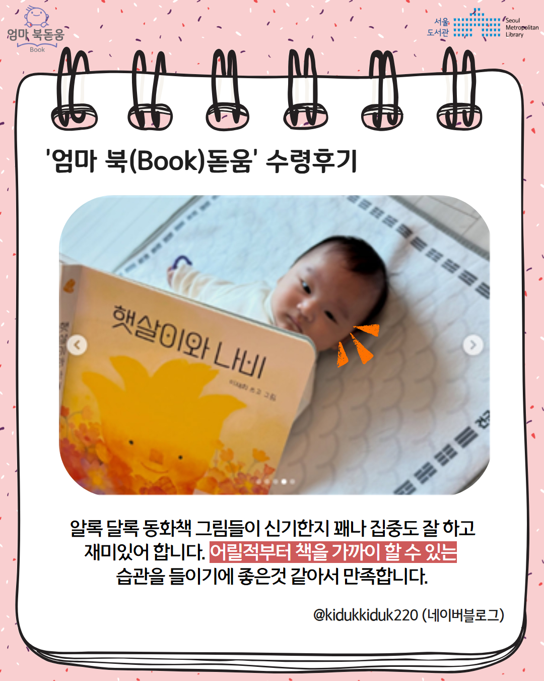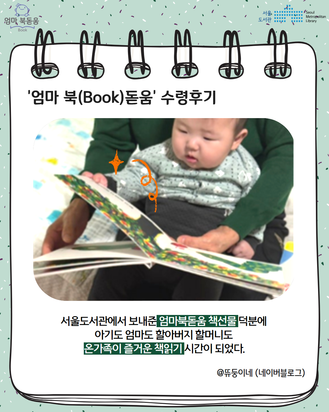 서울시 북스타트 엄마 북돋움 책선물을 받은 엄마아빠의 이야기를 들어보세요.